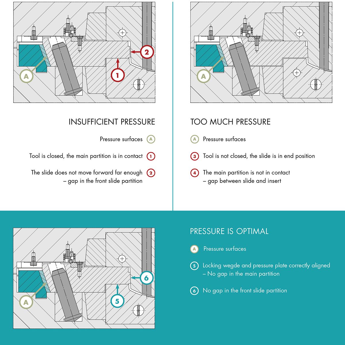 If the wedge angle is too large, the holding force is reduced and the slide can move slightly during injection. This in turn leads to burr formation on the component. Wedge angles that are set too small lock the slide very tightly, but at the same time also cause unnecessarily high wear and, in the worst case, even breakage. The precise coordination of the wedge and the contact surface is therefore of crucial importance.