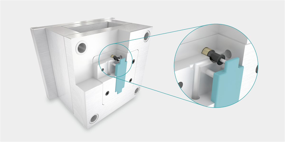 Das Messing-Umlenkelement ermöglicht den platzsparenden Einbau und insbesondere das Nachrüsten von Auswerfer- oder Konturstiften trotz Kreuzen des Kühlkreislaufs.