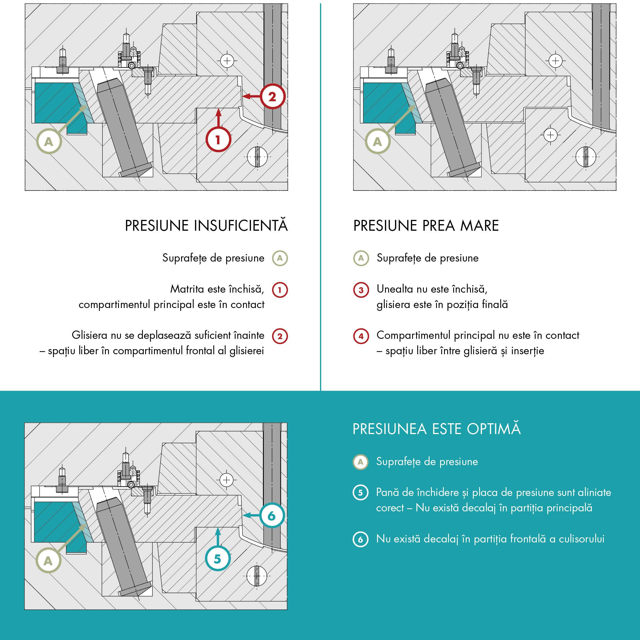 Dacă unghiul penei este prea mare, forța de reținere este redusă și glisorul se poate mișca ușor în timpul injecției. Acest lucru duce la formarea de bavuri pe componentă. Unghiurile penei care sunt setate prea mici blochează glisorul foarte strâns, dar în același timp provoacă o uzură inutil de mare și, în cel mai rău caz, chiar ruperea. Coordonarea precisă a penei și a suprafeței de contact este, prin urmare, de o importanță crucială.
